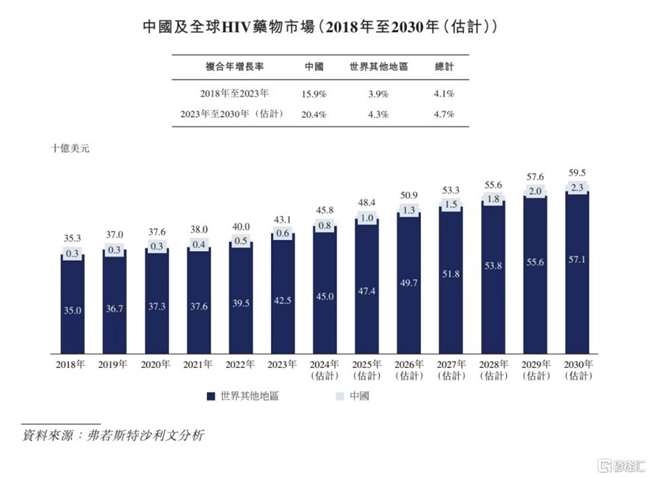 根據(jù)弗若斯特沙利文分析,到目前為止,全球艾滋病患者已超過(guò)4200萬(wàn),2030年預(yù)計(jì)超4800萬(wàn)。全球HIV藥物市場(chǎng)由2018年的353億美元增長(zhǎng)至2023年的431億美元,復(fù)合年增長(zhǎng)率為4.1%。估計(jì)2030年將達(dá)到595億美元,2023年至2030年的復(fù)合年增長(zhǎng)率為4.7%。