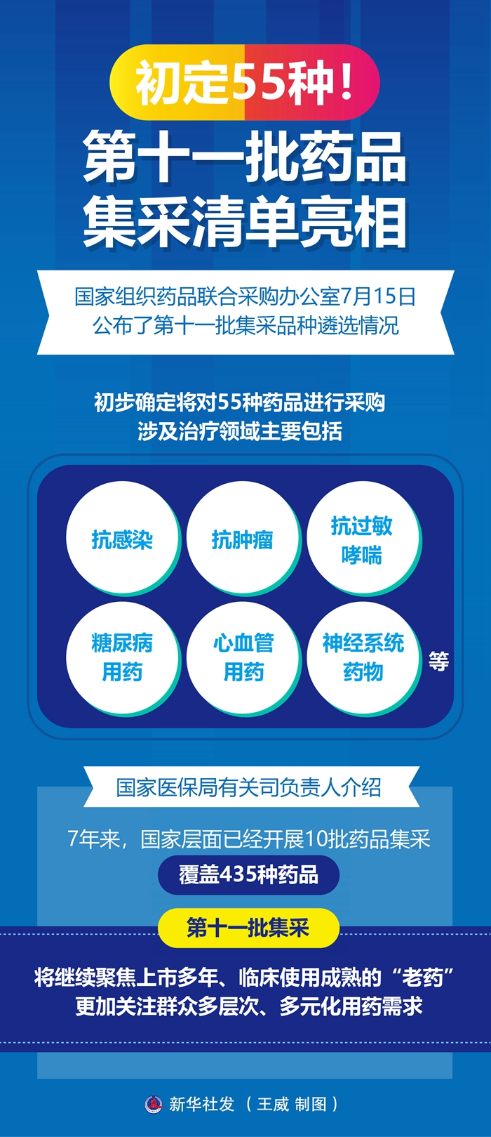 國家組織藥品聯(lián)合采購辦公室7月15日公布了第十一批集采品種遴選情況,初步確定將對(duì)55種藥品進(jìn)行采購,涉及治療領(lǐng)域主要包括抗感染、抗腫瘤、抗過敏哮喘、糖尿病用藥、心血管用藥、神經(jīng)系統(tǒng)藥物等。
