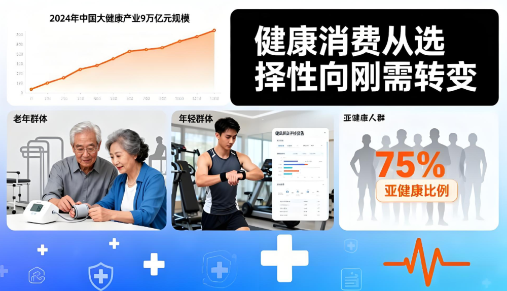 隨著生活水平的提高,人們健康意識(shí)不斷增強(qiáng),健康消費(fèi)需求正從“選擇性消費(fèi)”向“健康剛需”轉(zhuǎn)變。中國(guó)消費(fèi)者協(xié)會(huì)發(fā)布的報(bào)告顯示,2024年中國(guó)大健康產(chǎn)業(yè)總收入規(guī)模達(dá)到9萬億元,且仍在持續(xù)增長(zhǎng)。在老齡化加劇的背景下,老年群體對(duì)健康管理、康復(fù)護(hù)理等需求大增;同時(shí),年輕一代也更加注重生活品質(zhì)與健康預(yù)防,對(duì)個(gè)性化的健康服務(wù)如健康風(fēng)險(xiǎn)評(píng)估、科學(xué)運(yùn)動(dòng)指導(dǎo)等興趣濃厚。此外,亞健康人群規(guī)模龐大,據(jù)世界衛(wèi)生組織調(diào)查,全球約75%的人處于亞健康狀態(tài),這一群體對(duì)改善健康狀況的需求急切,為新賽道的健康管理服務(wù)提供了廣闊的市場(chǎng)空間。