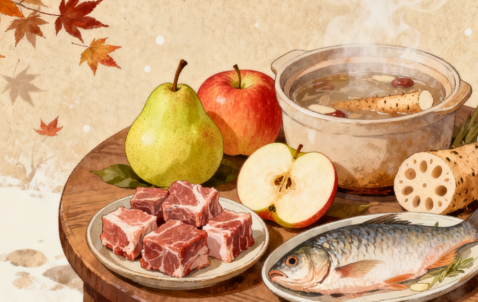 霜降是秋天的尾巴,每到這個時候,我們往往會感到更加干燥,很多人會出現(xiàn)口干、唇干、鼻干、咽干、皮膚干燥、大便干結(jié)等問題。這些都是因為燥邪耗傷津液導(dǎo)致的,所以建議以溫潤食材為主,兼顧防燥與御寒,如梨、蘋果、山藥、蓮藕等潤燥蔬果,搭配羊肉、魚肉等優(yōu)質(zhì)蛋白。減少寒性食物(如西瓜、苦瓜)和辛辣刺激物攝入,以防損傷脾胃。