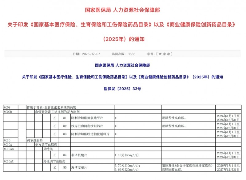 2025年12月7日,國家醫(yī)保局、人力資源社會保障部公布《國家基本醫(yī)療保險、工傷保險和生育保險藥品目錄(2025年)》,信立泰自主研發(fā)的信超妥?(沙庫巴曲阿利沙坦鈣片)成功入選醫(yī)保。這款藥物是最新獲得《中國高血壓防治指南(2024年版)》推薦的國產(chǎn)原研新一類降壓藥,全球第二款原研ARNI類降壓藥。