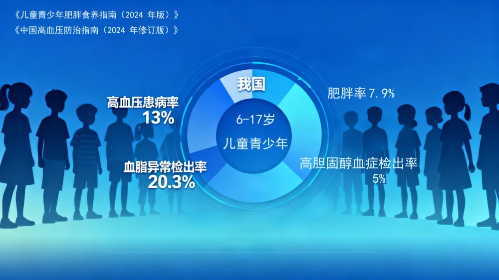 國家衛(wèi)生健康委發(fā)布的《兒童青少年肥胖食養(yǎng)指南(2024 年版)》顯示,我國6~17歲兒童青少年肥胖率已達(dá) 7.9%,成為誘發(fā)兒童代謝異常的首要因素。《中國高血壓防治指南(2024 年修訂版)》數(shù)據(jù)顯示,6~17歲學(xué)齡兒童高血壓患病率已攀升至13%,相當(dāng)于每7名兒童中就有1人存在血壓異常。首都兒科研究所的一項(xiàng)研究揭示,2017年北京市兒童青少年血脂異常檢出率達(dá)20.3%,高膽固醇血癥檢出率為5%。